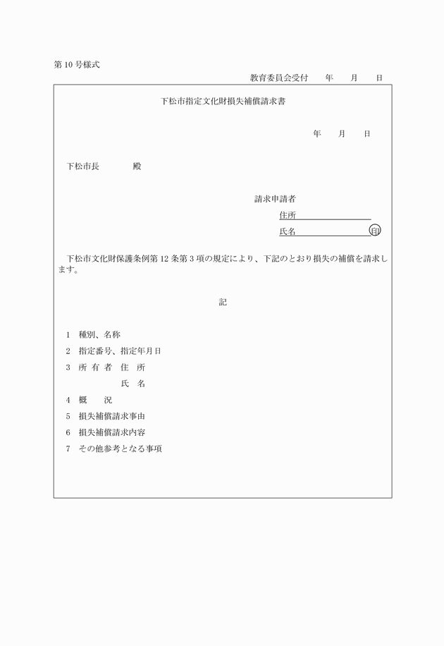 第13条 市指定文化財の所有者は、その市指定文化財の全部又は一部が滅失し、若しくは損傷し、又は、これを亡失したときは、下松市指定文化財滅失(損傷、亡失)届(別記第13号様式)により速やかに教育委員会に届け出なければならない。