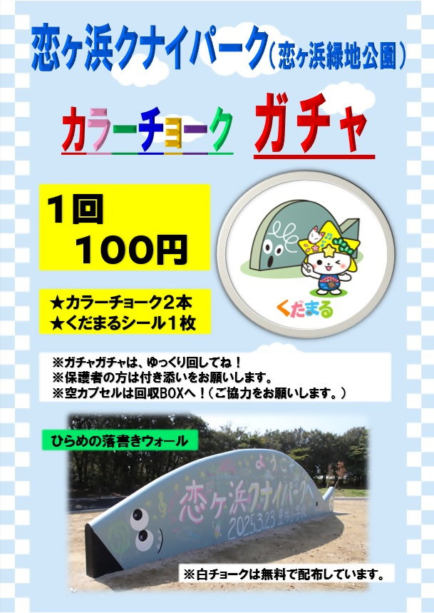 1回100円で利用できます。カプセルの中には「カラーチョーク2本」と「くだまるシール1枚」が入っています。